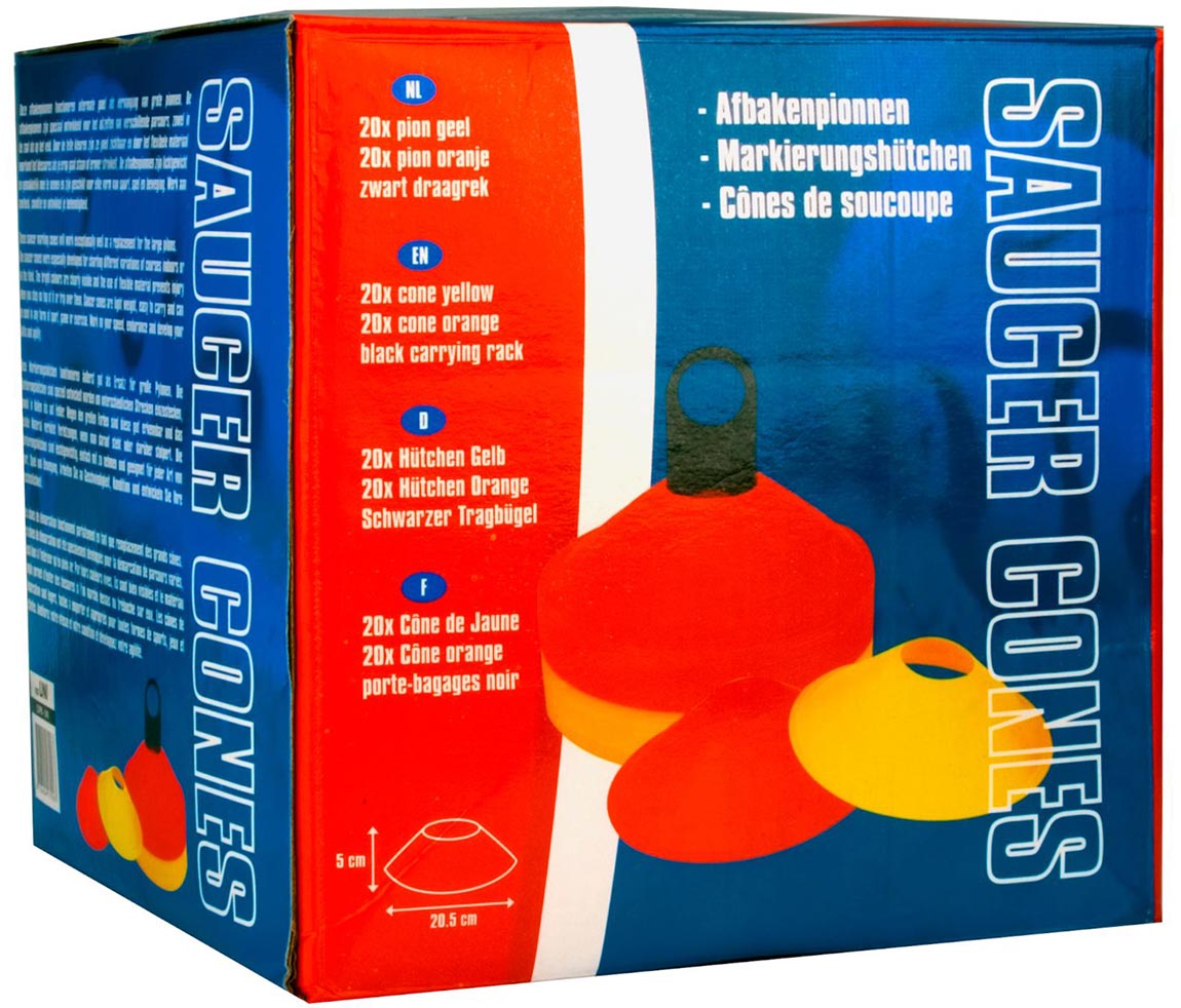 Veertig duidelijk zichtbare Avento afbakenpionnen in twee verschillende kleuren op een handig draagrek. Deze afbakenpionnen zijn uitermate geschikt voor team trainingen, het uitzetten van een trainingsveld of parcours. De set pionnen bestaat uit 20 x geel en 20 x oranje.