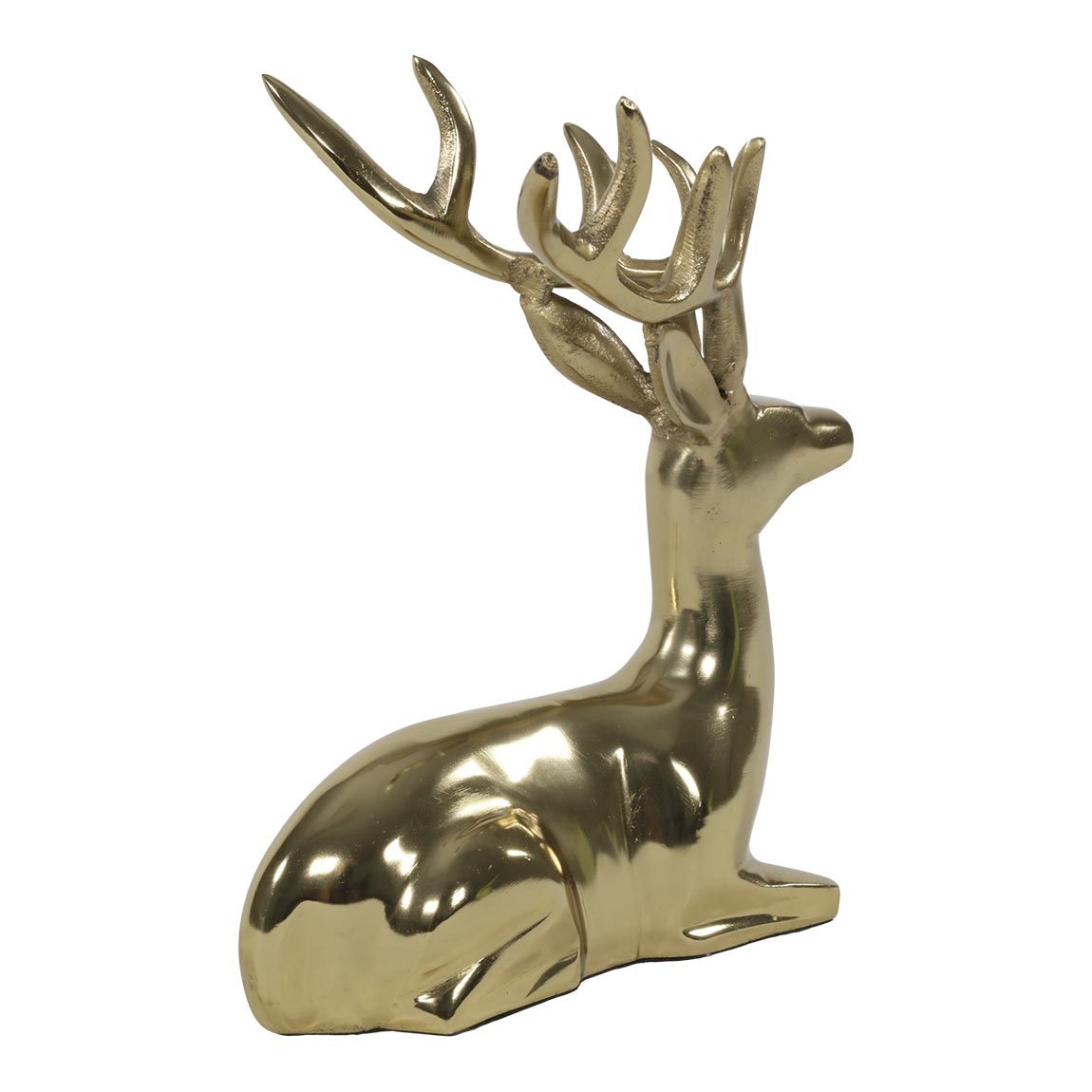 Beeld liggend hert gemaakt van gepolijst aluminium. Dit beeld is goud van kleur en 23 cm hoog. een leuk item om te combineren met andere gouden of zilveren beelden uit ons assortiment.