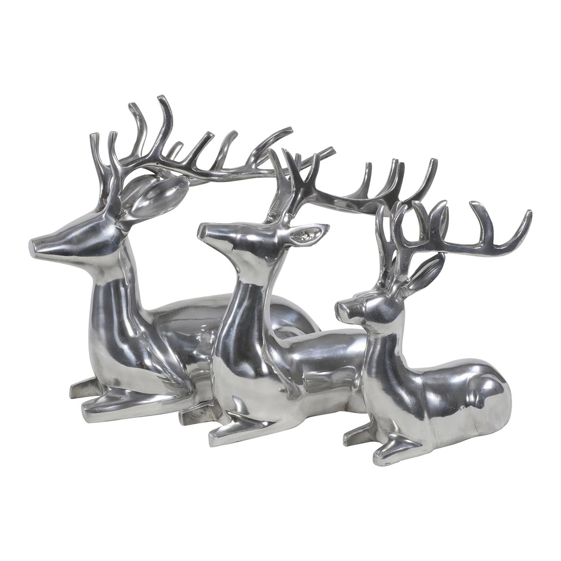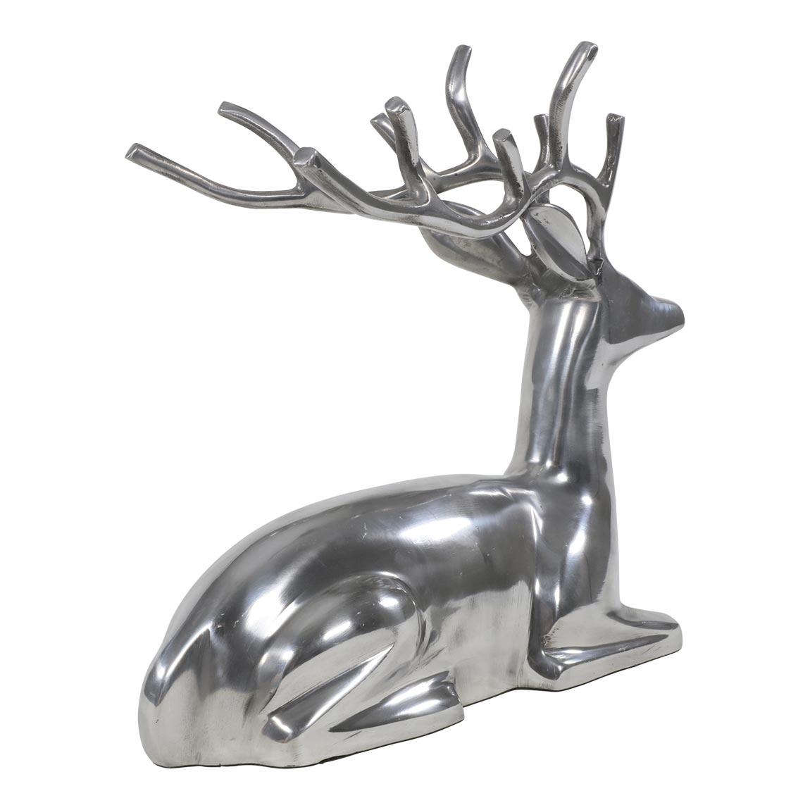 Beeld liggend hert gemaakt van gepolijst aluminium. Dit beeld is zilver van kleur en 30 cm hoog. een leuk item om te combineren met andere zilveren of gouden beelden uit ons assortiment.