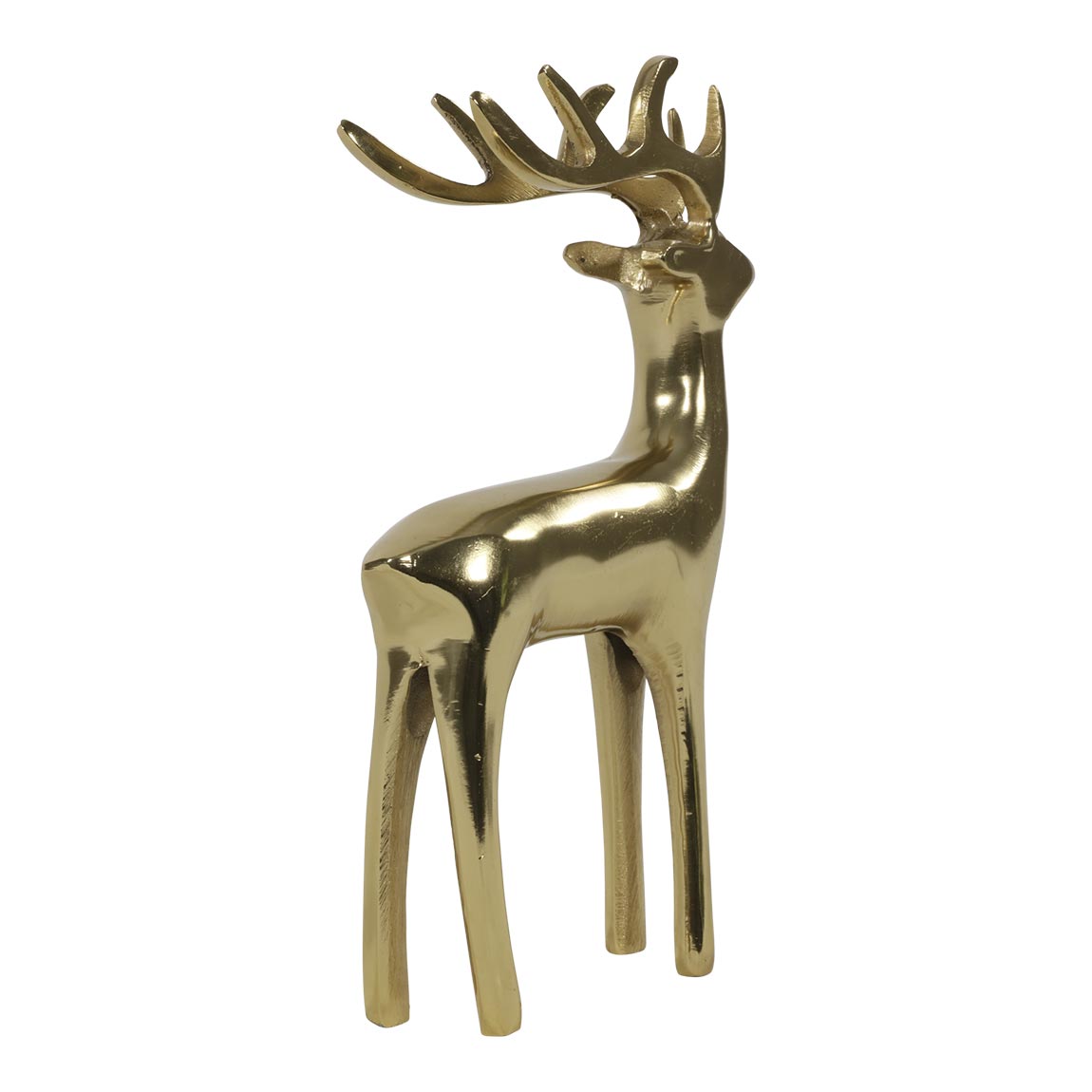 Beeld staand hert gemaakt van gepolijst aluminium. Dit beeld is goud van kleur en 20 cm hoog. een leuk item om te combineren met andere gouden of zilveren beelden uit ons assortiment.