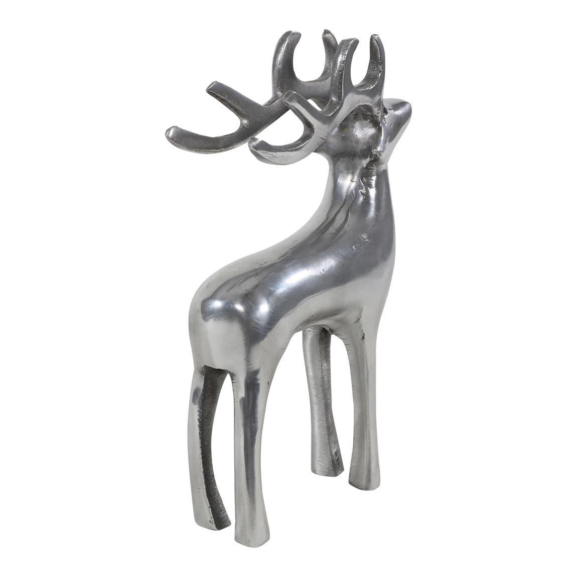 Beeld staand hert gemaakt van gepolijst aluminium. Dit beeld is zilver van kleur en 20 cm hoog. een leuk item om te combineren met andere zilveren of gouden beelden uit ons assortiment.