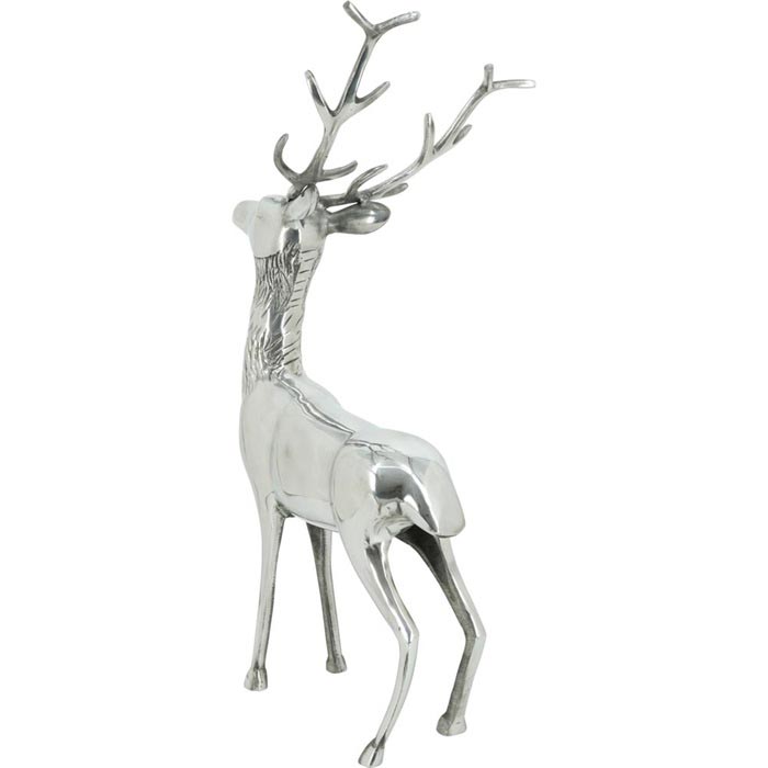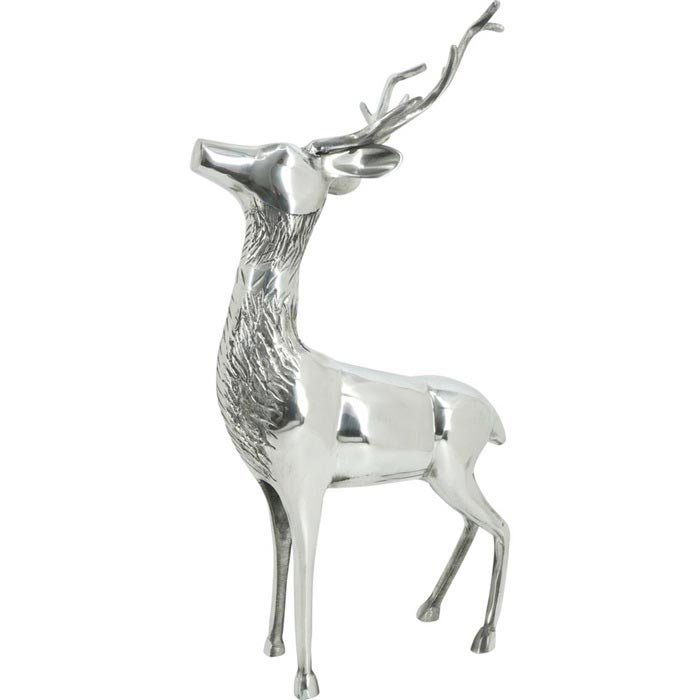 Beeld staand hert (bont) gemaakt van gepolijst aluminium. Dit beeld is zilver van kleur en 77 cm hoog. een leuk item om te combineren met andere zilveren of gouden beelden uit ons assortiment.