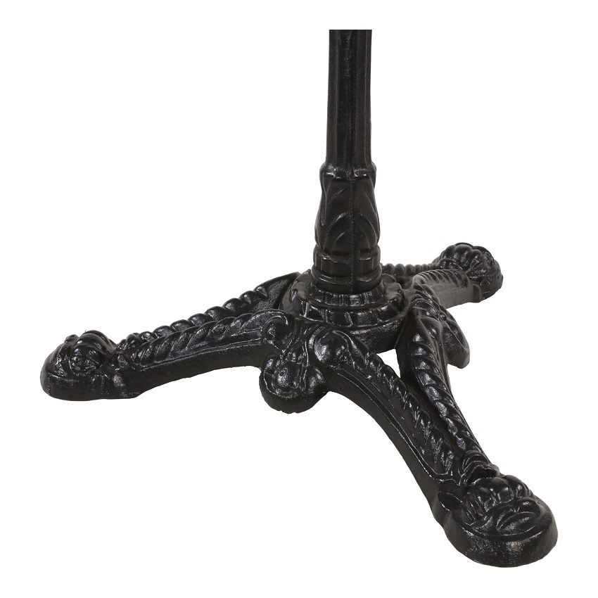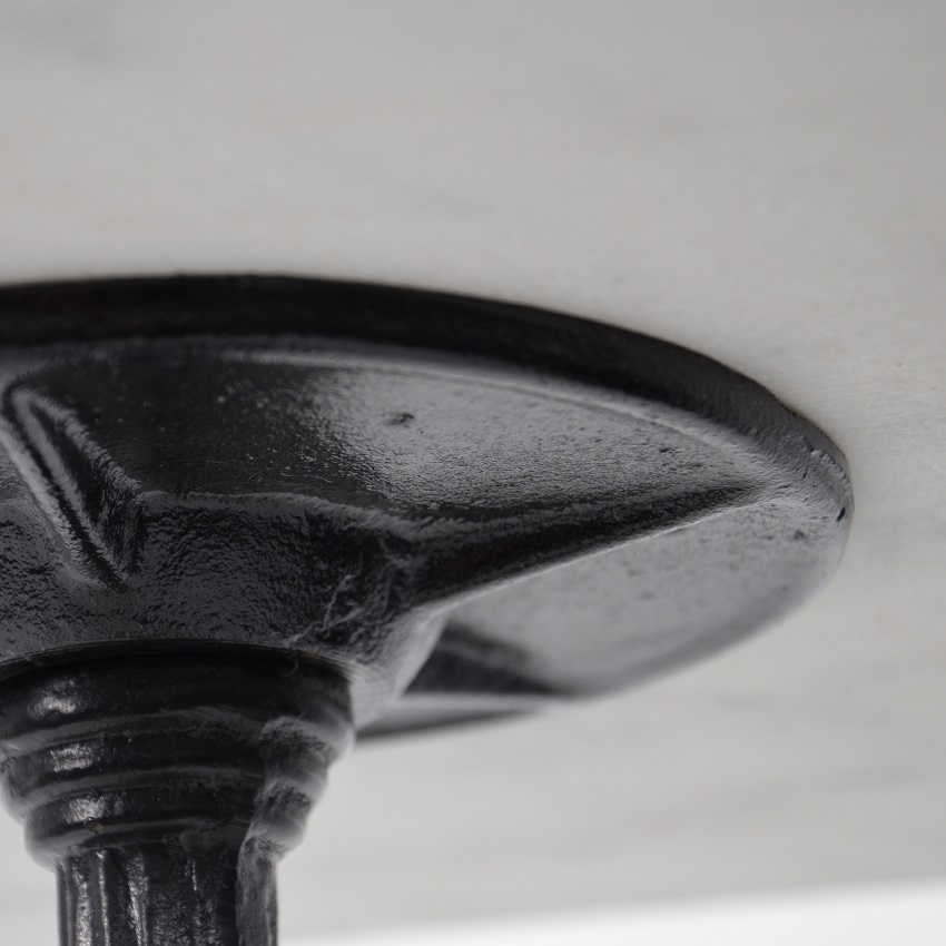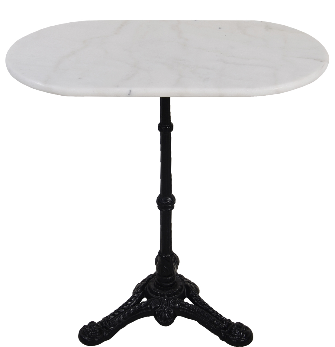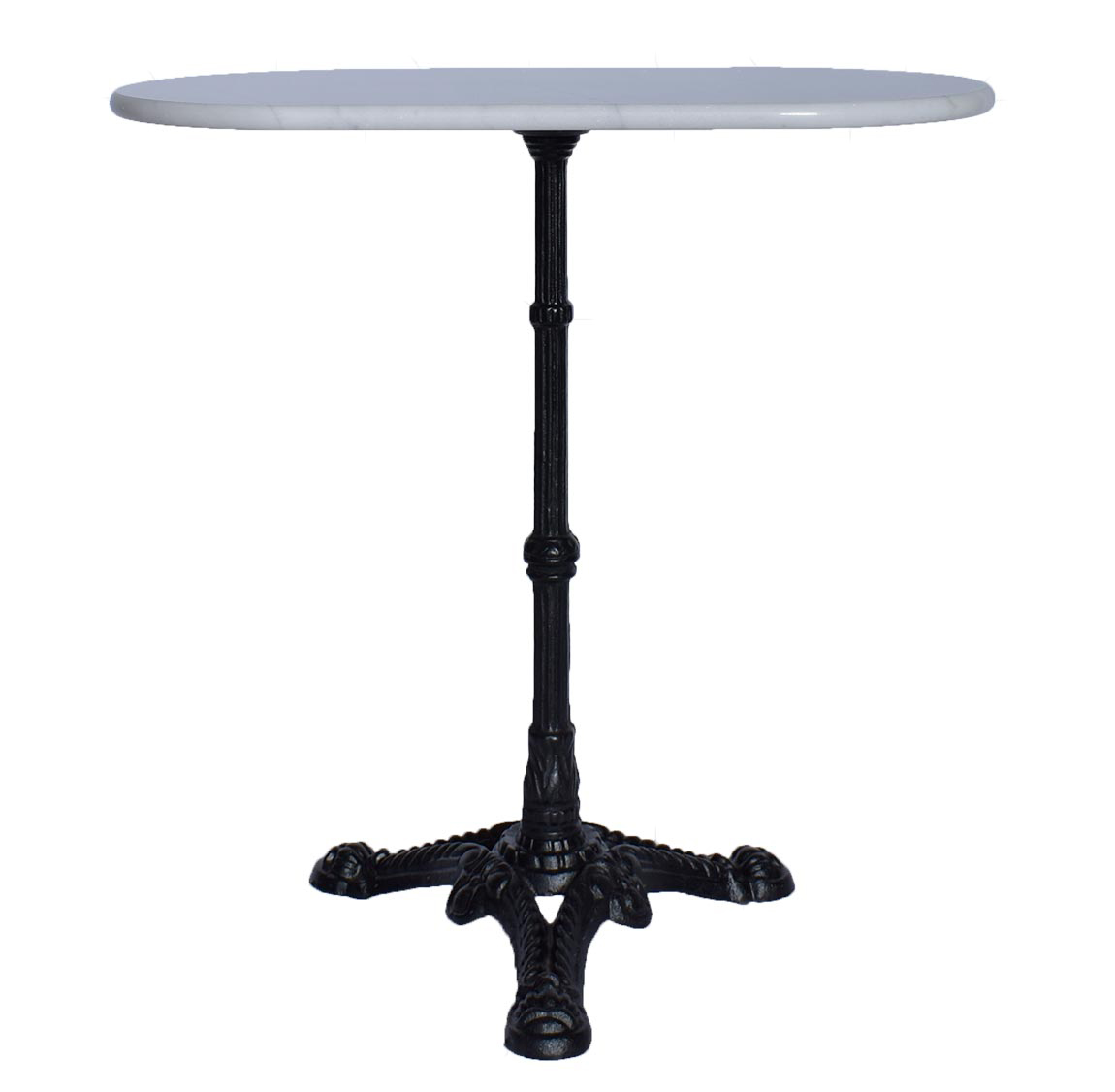 Bistrotafel marmer ovaal met gietijzeren voet. Het ovaal marmeren tafelblad is 70 cm lang en 40 cm breed. De tafel is 73 cm hoog. Het tafelonderstel is gemaakt van gietijzer en heeft een 3-teens voet. Deze marmeren bistrotafel is geschikt voor zowel binnen als buiten gebruik.