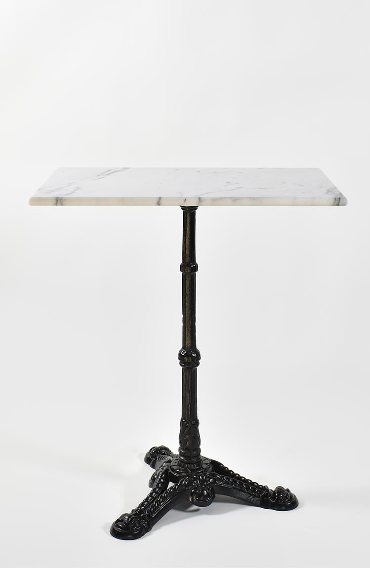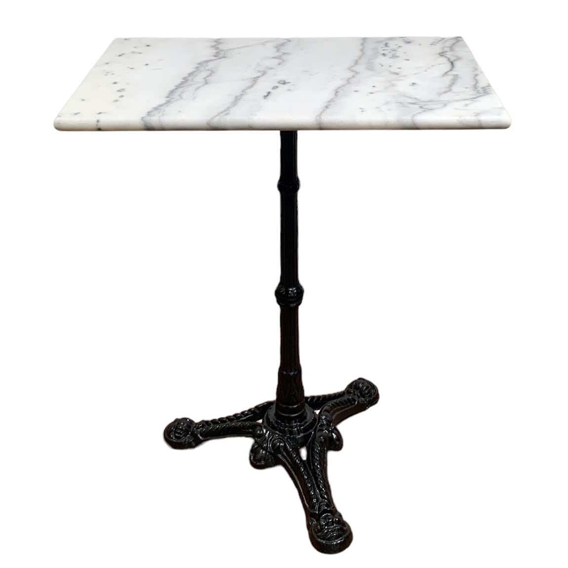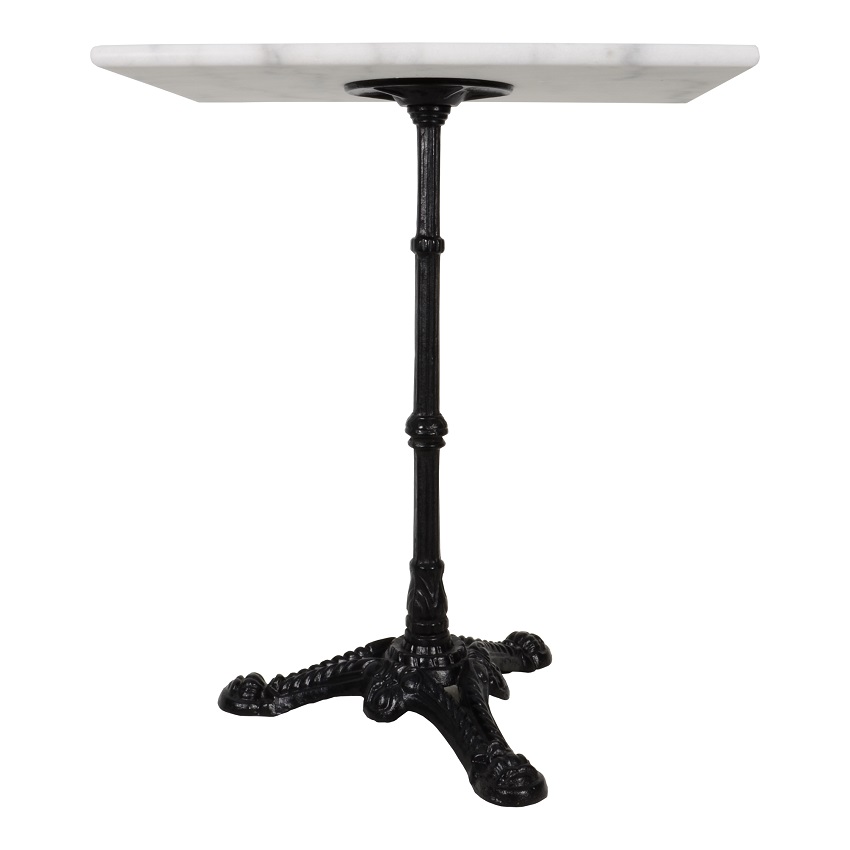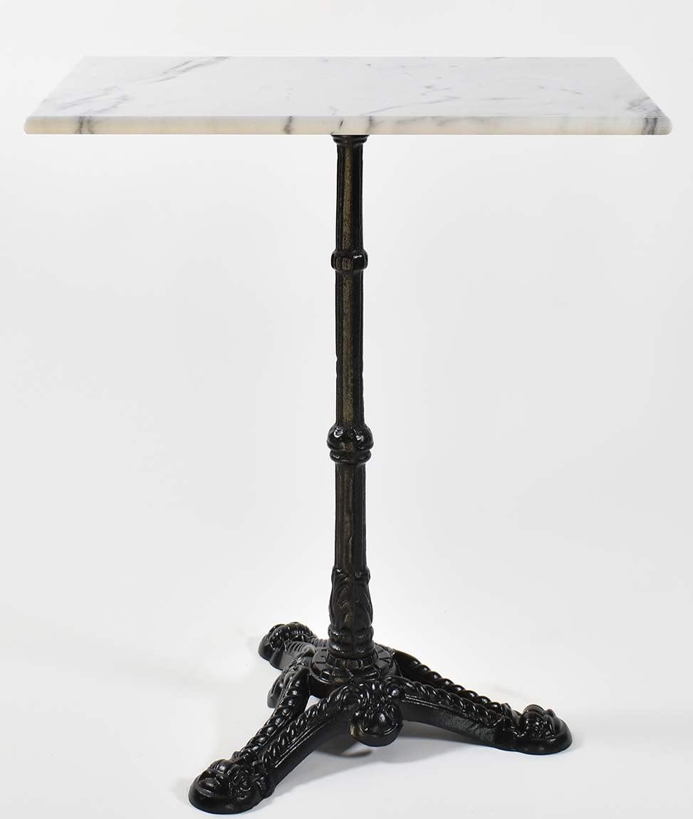 Bistrotafel marmer rechthoek met gietijzeren tafelonderstel. Het marmeren tafelblad heeft een afmeting van 60 x 40 cm en de tafel is 72 cm hoog. Het tafelonderstel is gemaakt van gietijzer en heeft een 3-teens voet. Deze marmeren bistrotafel is geschikt voor zowel binnen als buiten gebruik.