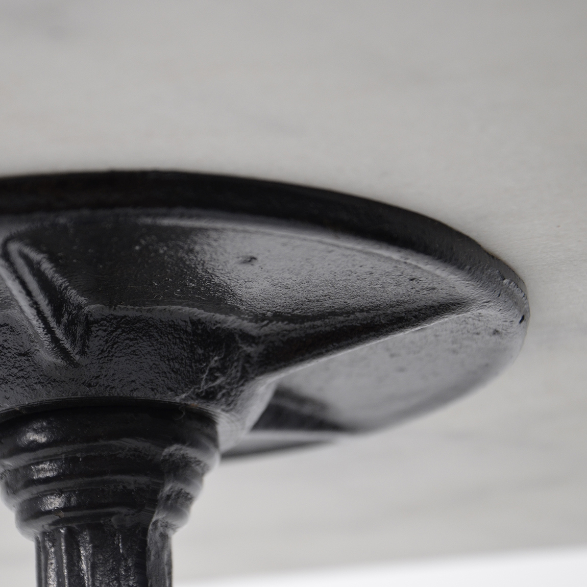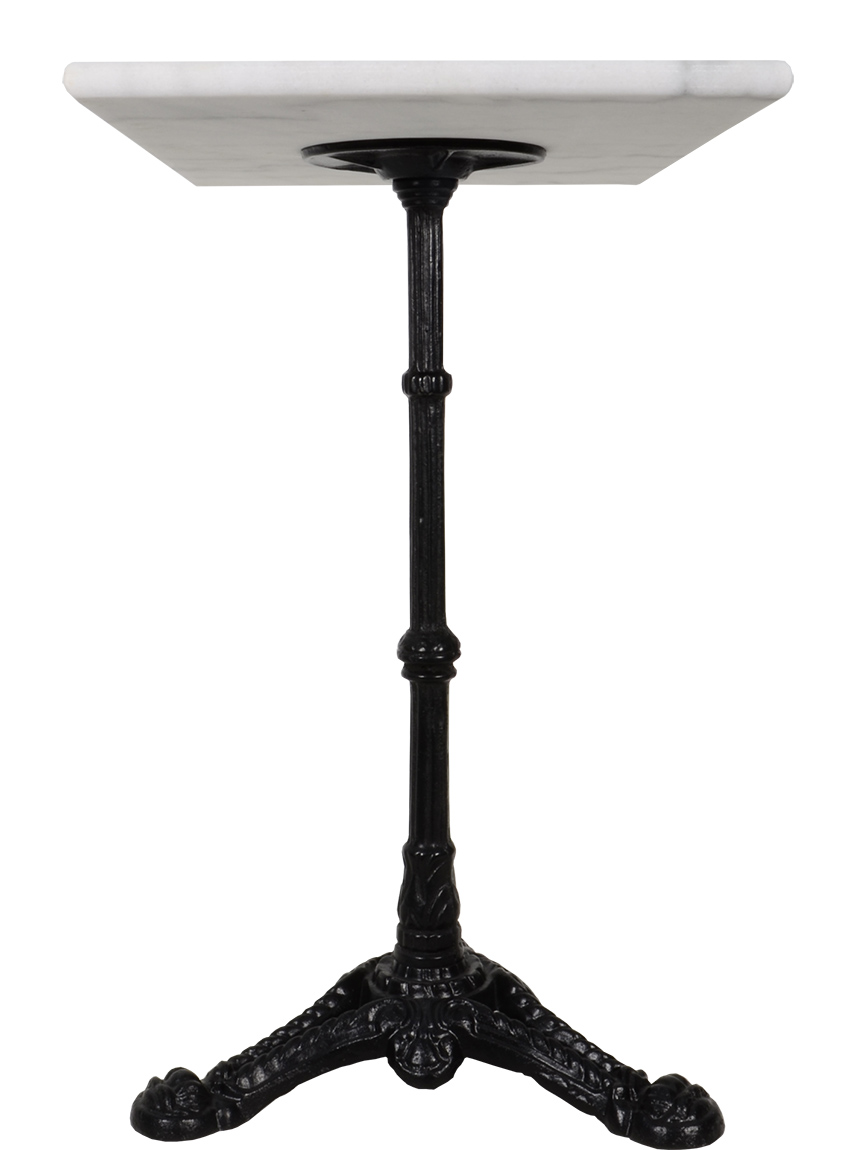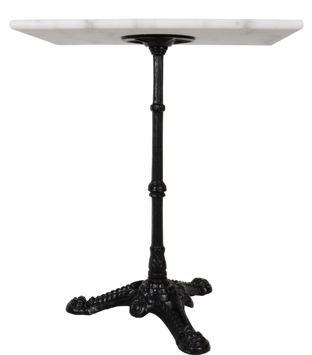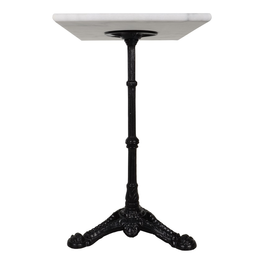 Bistrotafel marmer rechthoek met gietijzeren tafelonderstel. Het marmeren tafelblad heeft een afmeting van 60 x 40 cm en de tafel is 72 cm hoog. Het tafelonderstel is gemaakt van gietijzer en heeft een 3-teens voet. Deze marmeren bistrotafel is geschikt voor zowel binnen als buiten gebruik.