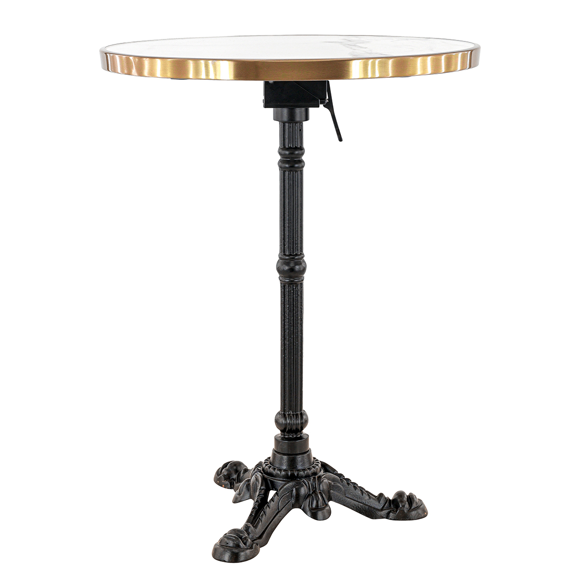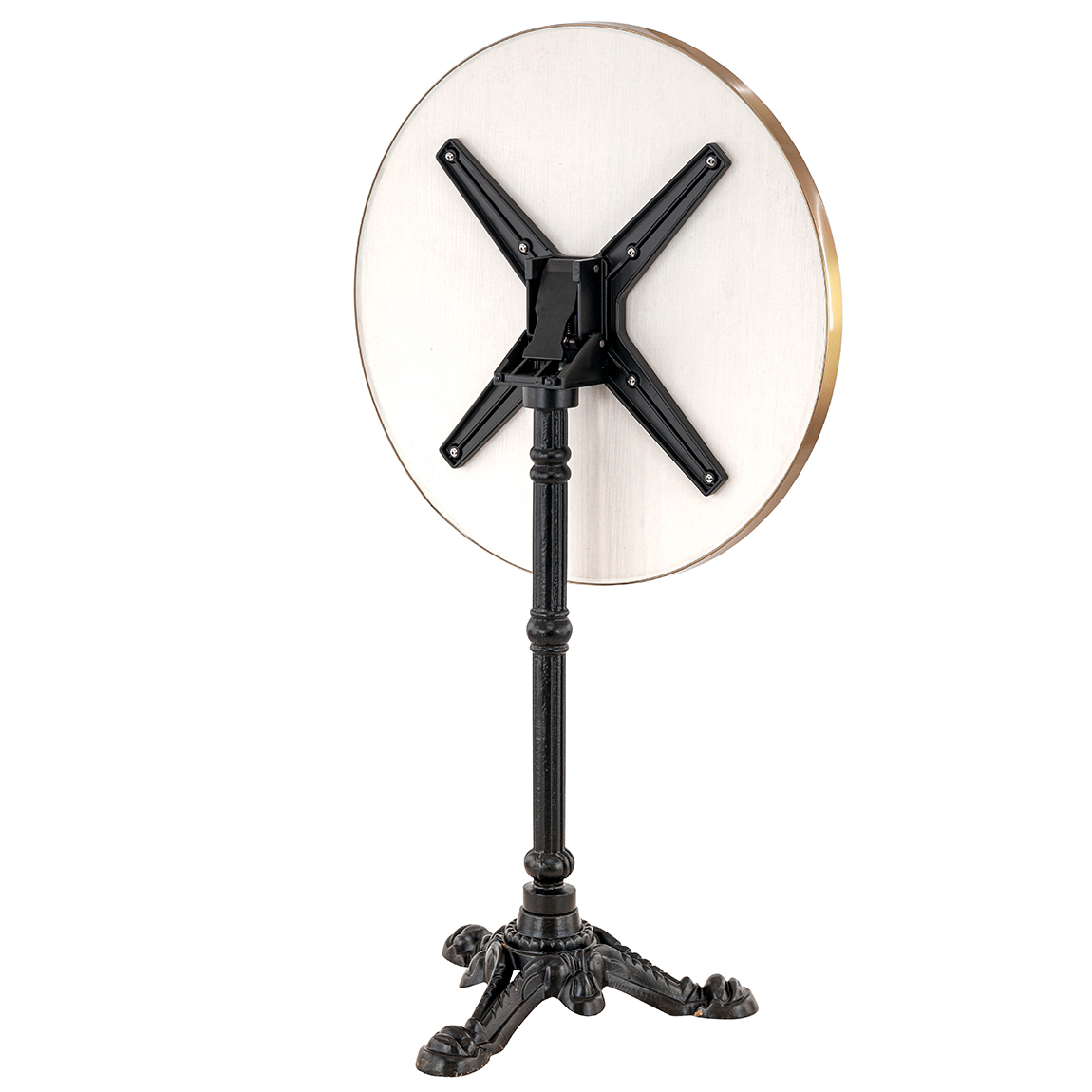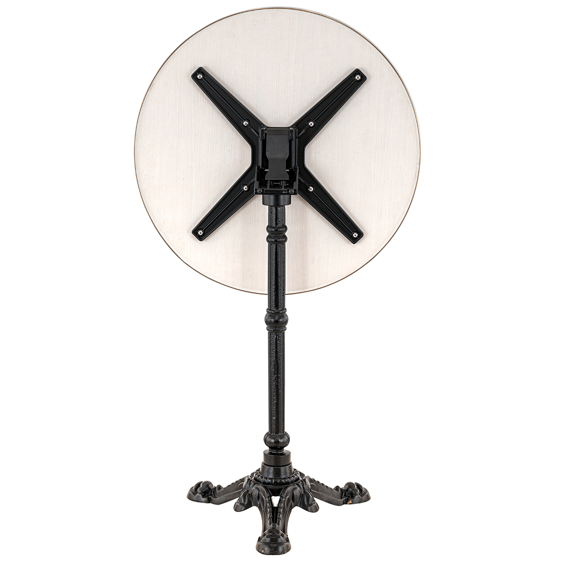 Deze ronde inklapbare bistrotafel is een uitstekende keuze voor wie op zoek is naar een combinatie van functionaliteit, duurzaamheid en elegantie. De bistrotafel heeft een gietijzeren tafelonderstel en marmerlook tafelblad. Het tafelblad is gemaakt van 5 mm HPL en 22 mm melamine multiplex en is voorzien van een 3 cm dikke gegalvaniseerde roestvrijstalen sierring. Het gietijzeren onderstel heeft een 3-teens voet en is voorzien van een vouwmechanisme. De verstelbare doppen zorgen ervoor dat de tafel stabiel staat.
