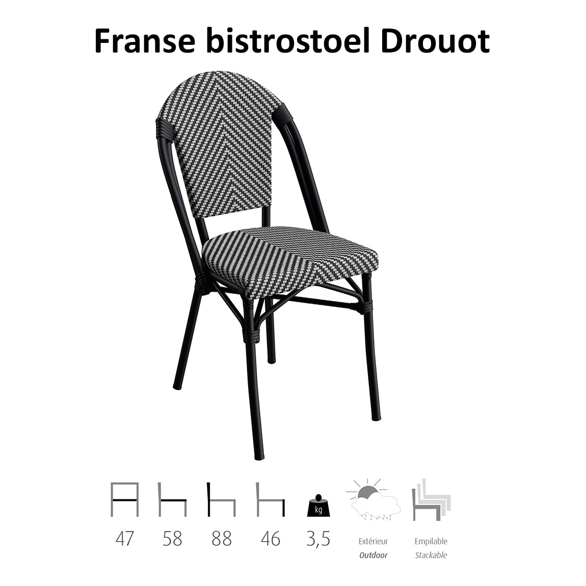 Franse bistrostoel model Drouot, ook wel bekend als een Parijse bistrostoel. Deze stijlvolle stoel is een type stoel dat vaak wordt geassocieerd met de traditionele Franse bistro's en cafés. De stoel heeft als kenmerkend ontwerp een aluminium frame en een zitting en rugleuning die gemaakt is van gevlochten rotan (wicker). Deze stoel is licht van gewicht, stapelbaar en duurzaam, wat deze bistrostoel geschikt maakt voor binnen en buiten gebruik.