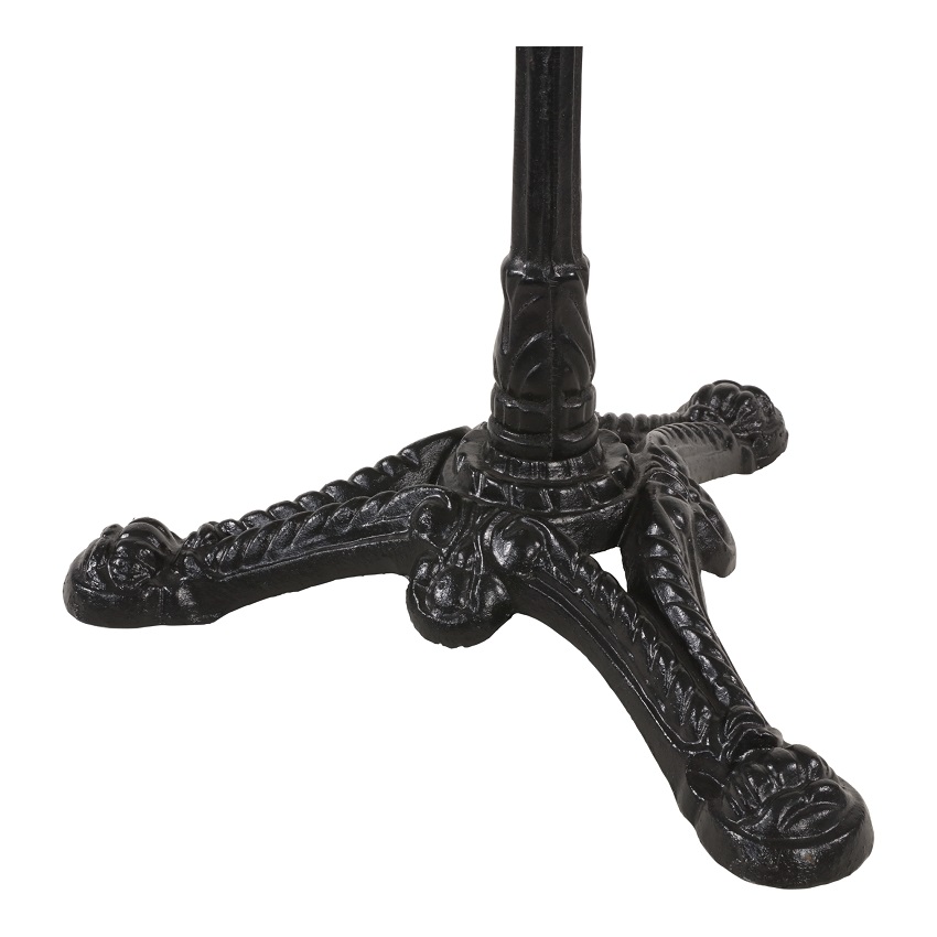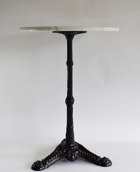 Marmeren tafel met gietijzeren tafelonderstel. Deze klassieke bistrotafel heeft een 50 cm rond marmer tafelblad en een tafelonderstel dat gemaakt is van gietijzer. Het wit marmeren tafelblad is 2 cm dik en mooi rond afgewerkt. Omdat marmer een natuurproduct is heeft elk tafelblad zijn eigen structuur. Elk tafelblad is hierdoor uniek. Het gietijzeren tafelonderstel (model Parijs) is zwart van kleur en heeft een 3-teens voet met klassieke details. Deze tafel is geschikt voor binnen en buiten gebruik en wordt vaak gebruikt in bistro’s, cafés, hotels en restaurants. Daarnaast is deze tafel ook geschikt als terrastafel, tuintafel en balkontafel.