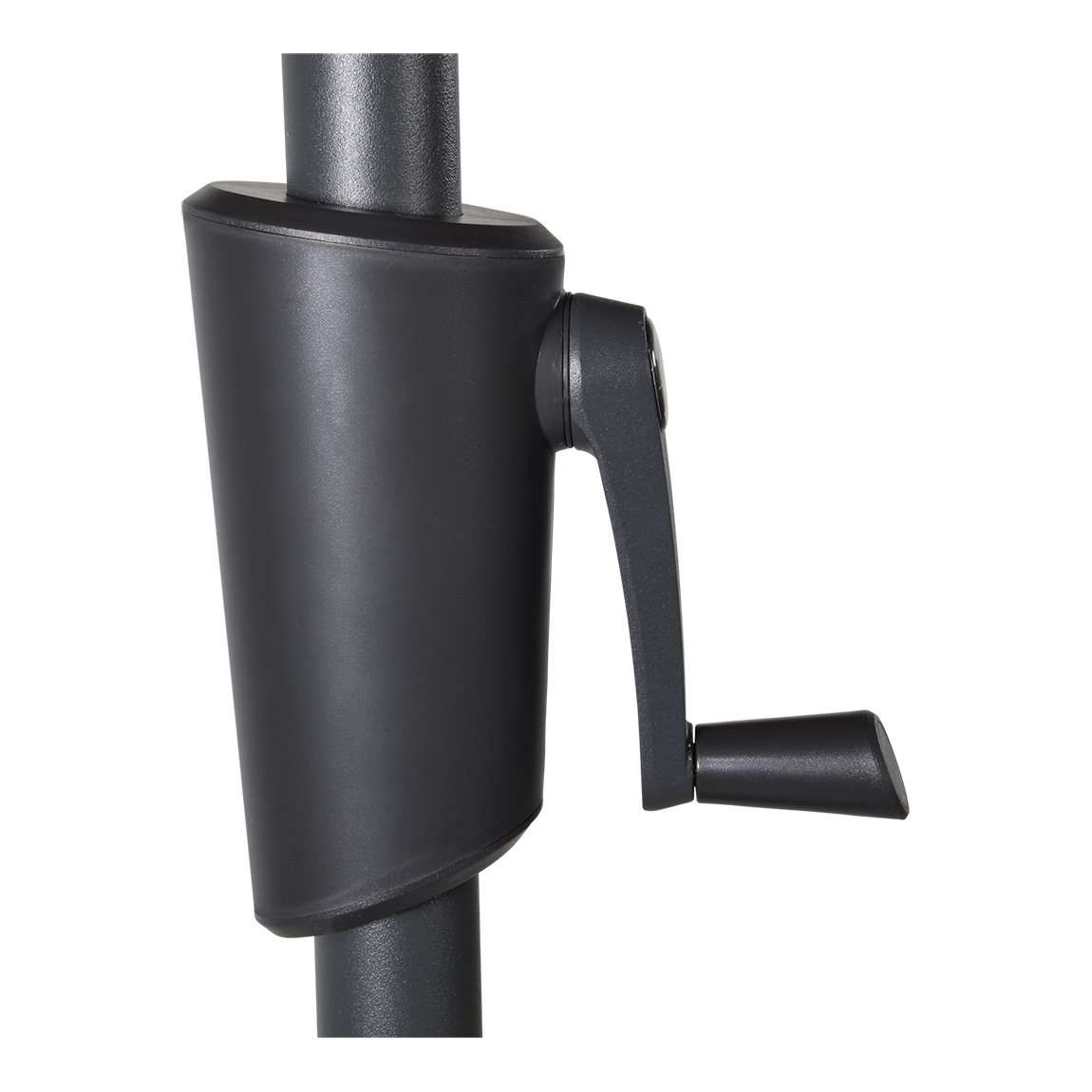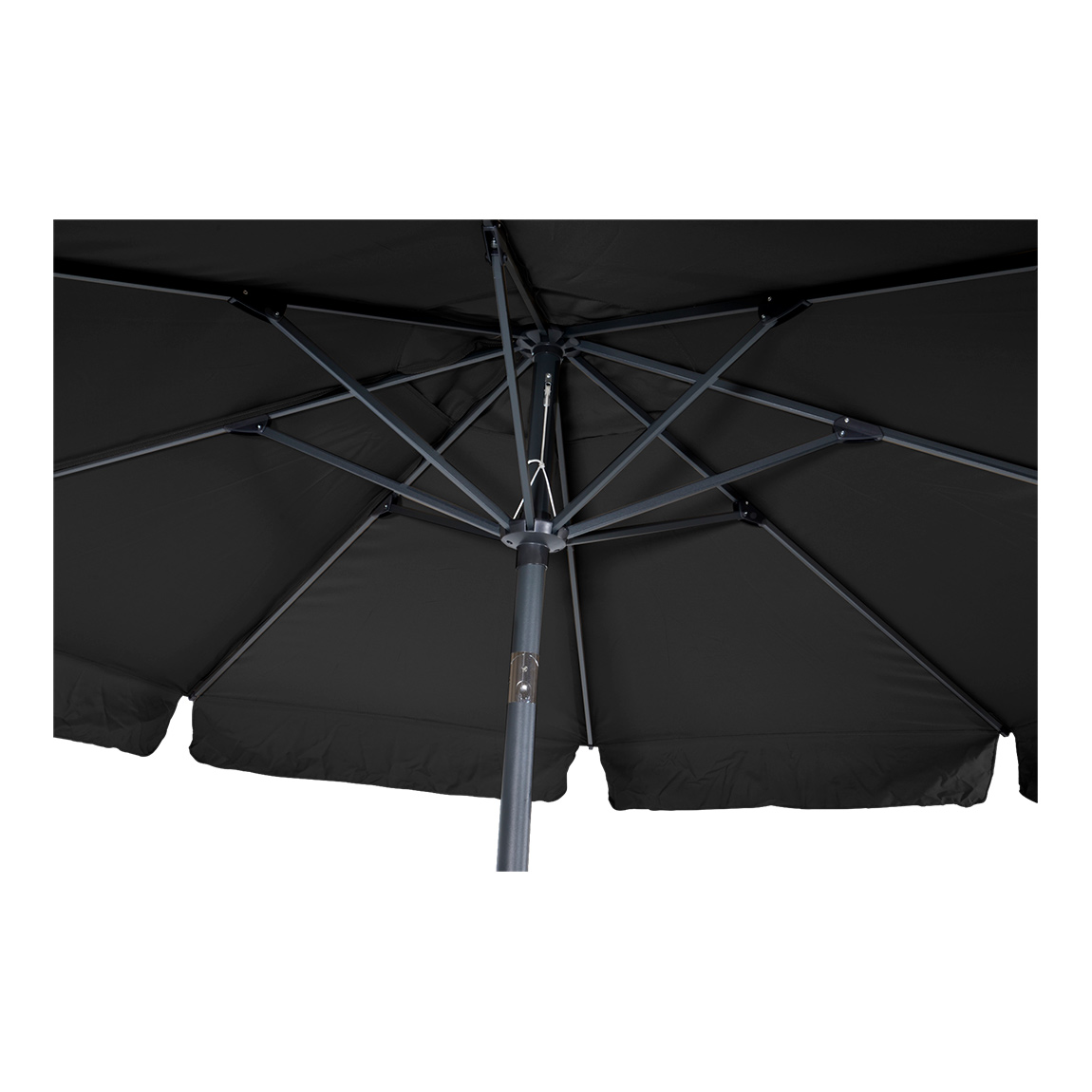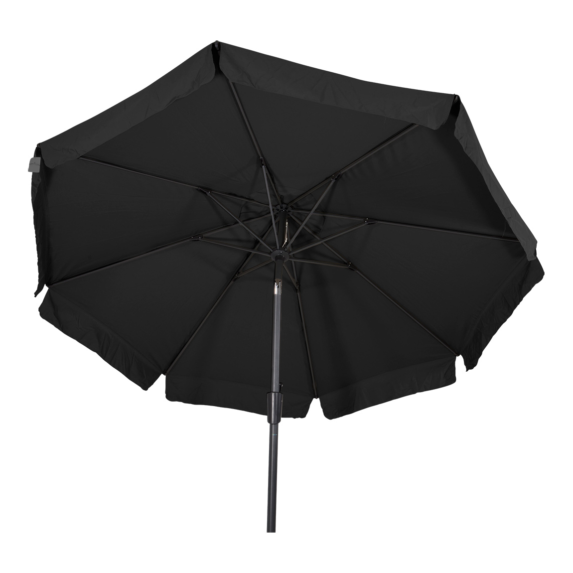 Parasol model Libra met molen en volan. Deze parasol heeft een diameter van 3 meter en heeft een antraciet aluminium frame met zwart doek. Verder is deze parasol kantelbaar, heeft een veersysteem en 8 metalen baleinen.