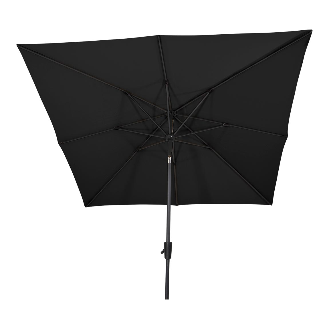 Vierkante parasol met molen. Deze parasol is 2,5 meter lang en 2,5 meter breed. De parasol heeft een antraciet aluminium frame met zwart doek. 8 metalen baleinen met veersysteem.