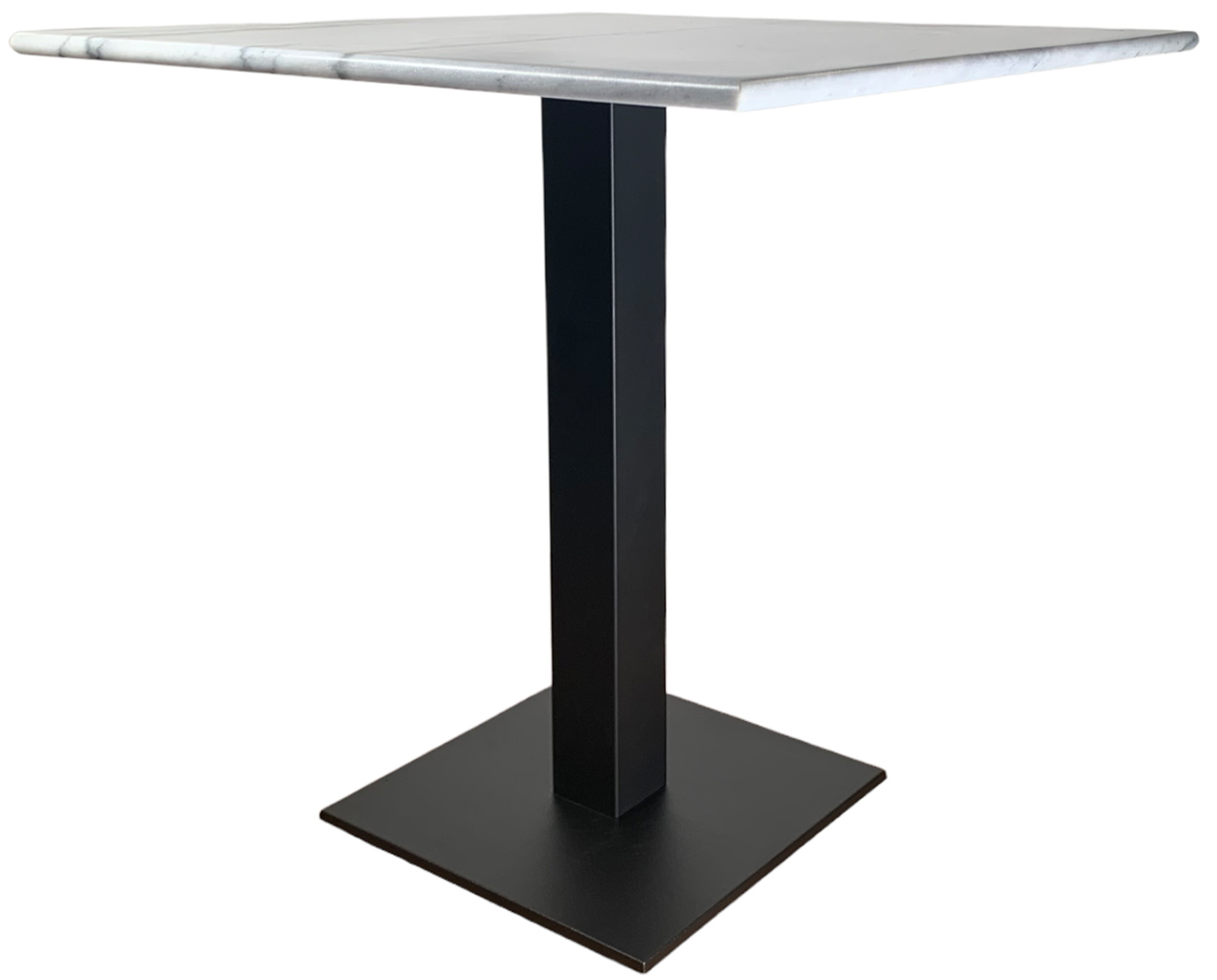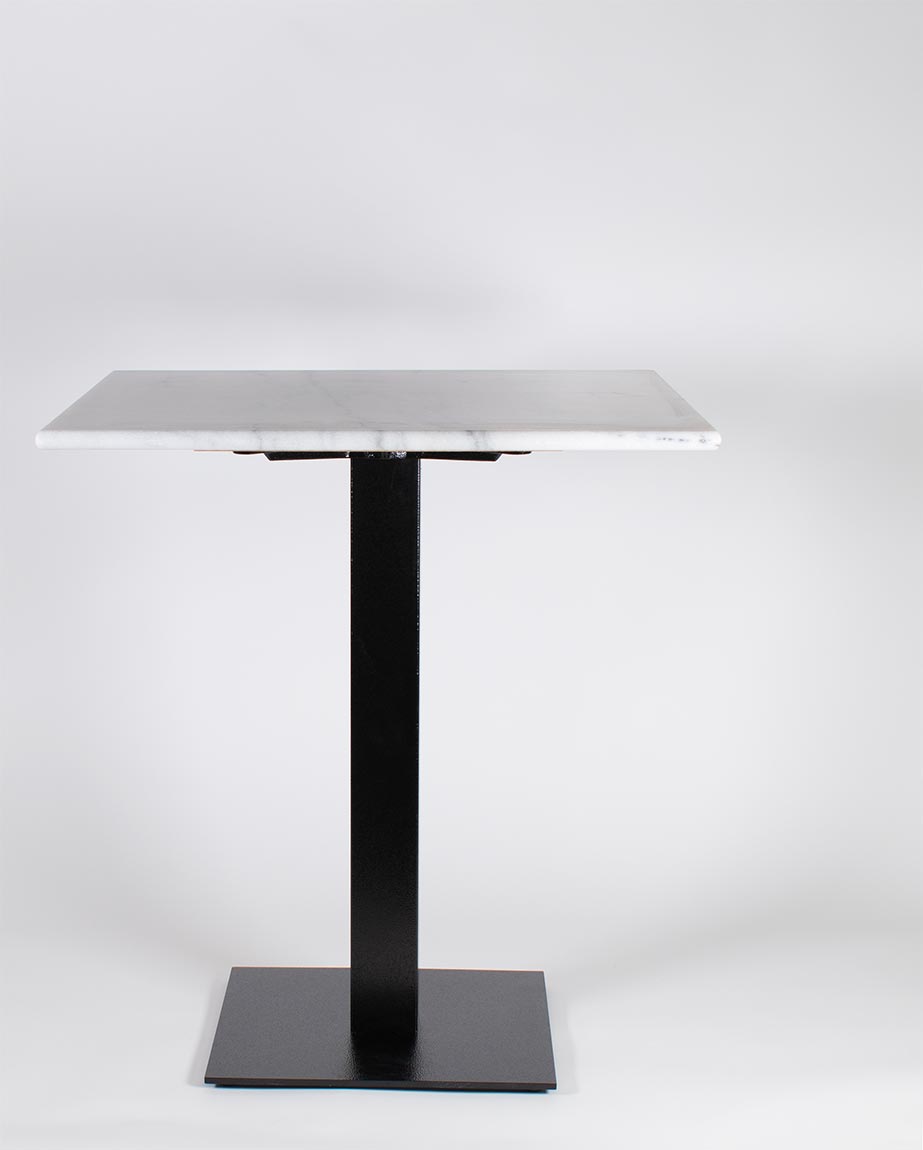 Vierkante eettafel met een marmer tafelblad van 70 x70 cm en metaal onderstel. De tafel is 75 cm hoog. Het onderstel heeft een vierkante voet van 40 x 40 cm. Het tafelblad wordt aan het onderstel bevestigd d.m.v. een houten montageplaat. Dit is al door ons voor gemonteerd. Het tafelblad dient alleen nog aan het onderstel vastgemaakt te worden met de meegeleverde schroeven.
