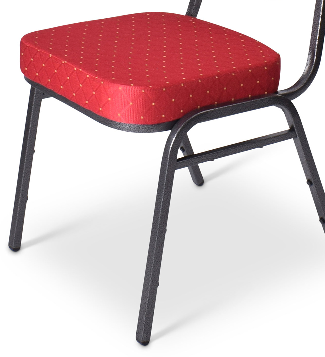 Stackchair stapelstoel model Sidney. Deze stoel heeft een blauw stoffen bekleding met gouden stippen. De stoel heeft een klassieke uitstraling, is goed afgewerkt en stapelbaar tot 12 stoelen. De welbekende stackchair is een van de populairste stoelen onder de stapelstoelen. De stoel heeft een metalen frame (hamerslag) van 20 x 20 x 1,2 mm, dit betekent dat het een zeer degelijk onderstel heeft. De zitting is voorzien van een 6 cm stevige schuimzitting wat voor extra zitcomfort zorgt. De stoel is stevig en stabiel, zeer geschikt voor professioneel gebruik. Dit kenmerkt zich onder andere door een extra verstevigingsbalk onder de zitting, goede stootbestendige poedercoating en een high density foam zitting.