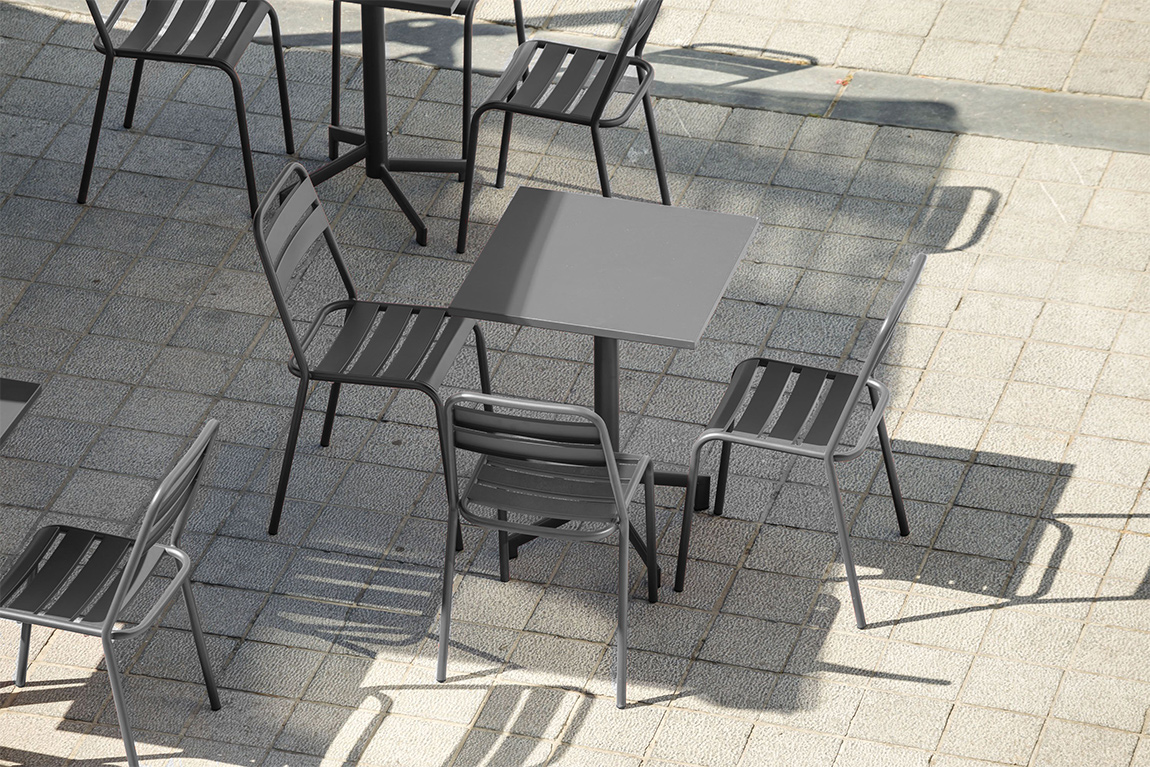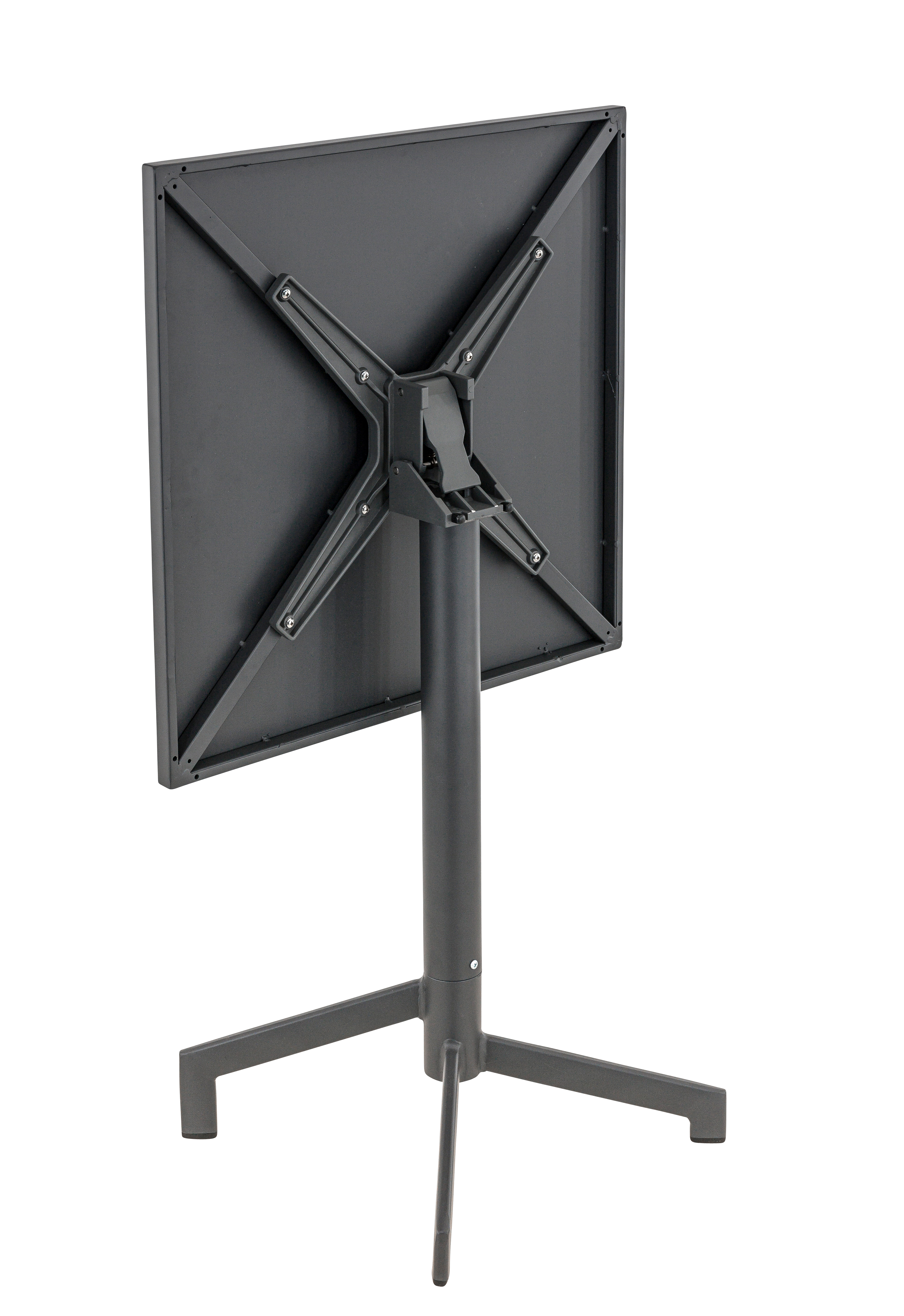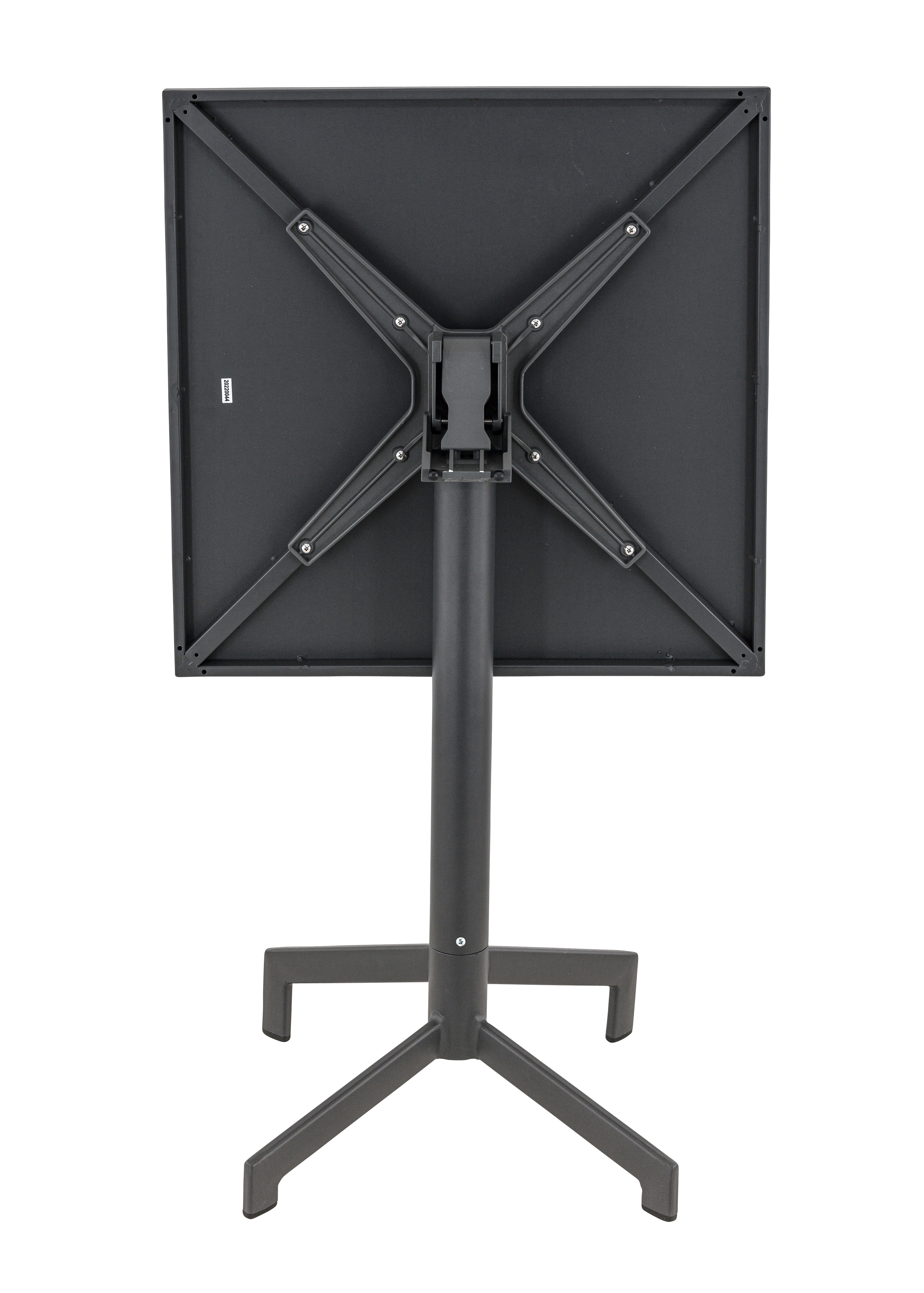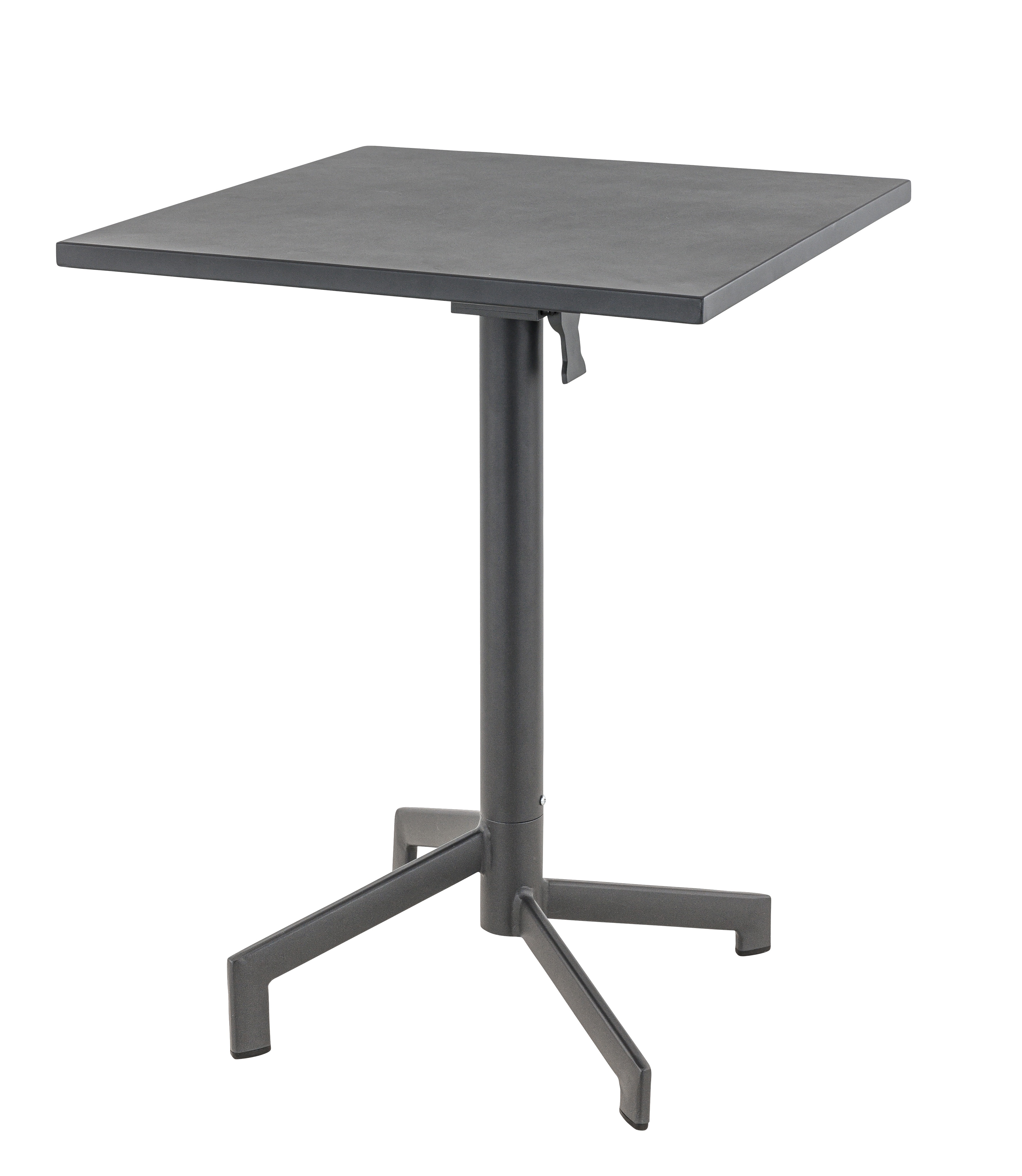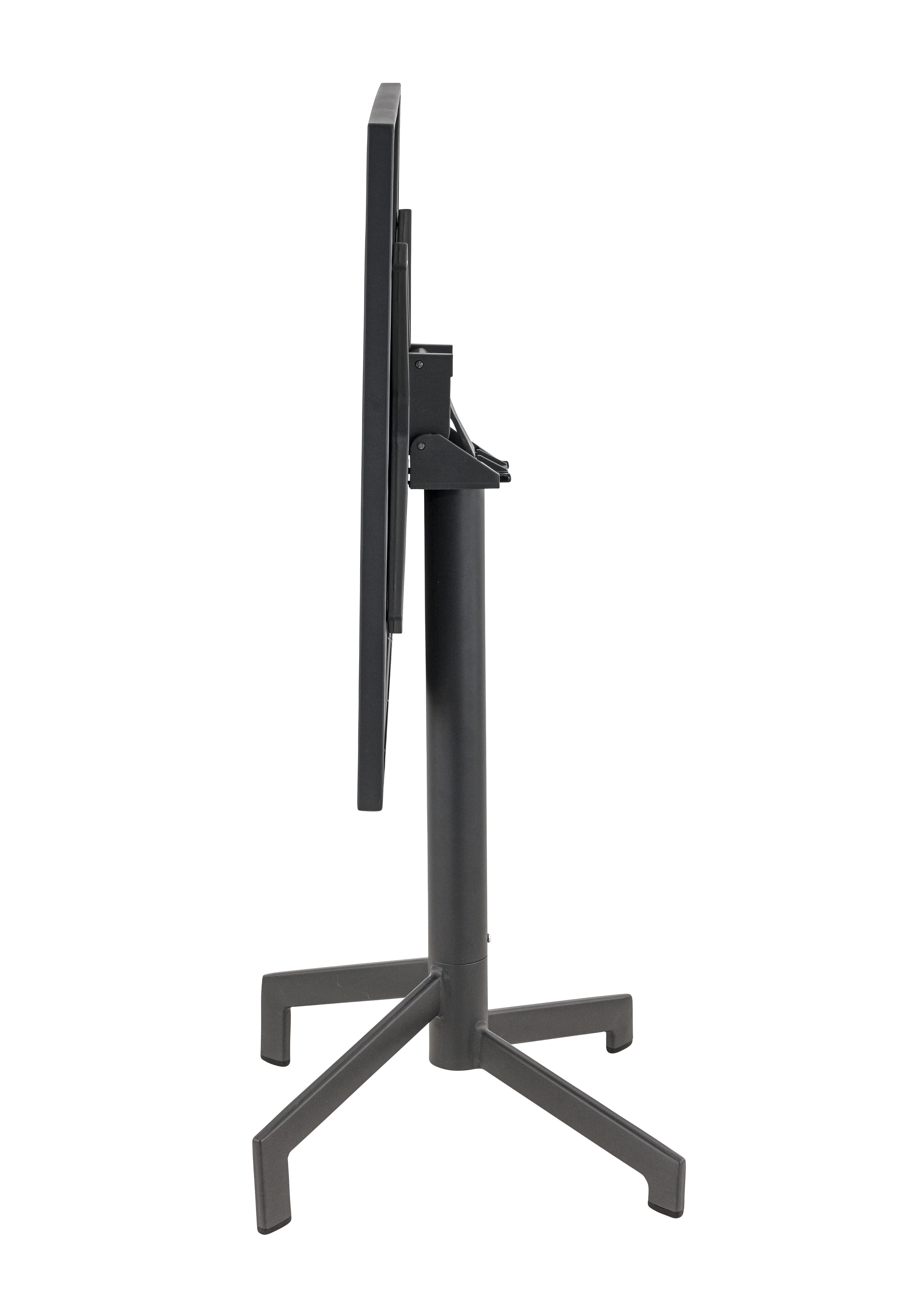 Terrastafel inklapbaar metaal kleur antraciet model Pigalle. Deze vierkante tafel heeft een afmeting tafelblad van 60 x 60 cm en is 75,5 cm hoog. Deze terrastafel is ideaal voor terrassen die na sluitingstijd opgeborgen moeten worden. Doordat de tafel inklapbaar is kunnen diverse tafels goed in elkaar geschoven worden waardoor het weinig ruimte inneemt.