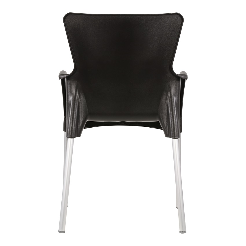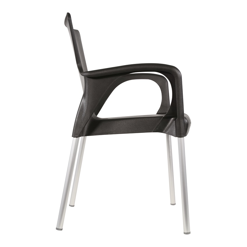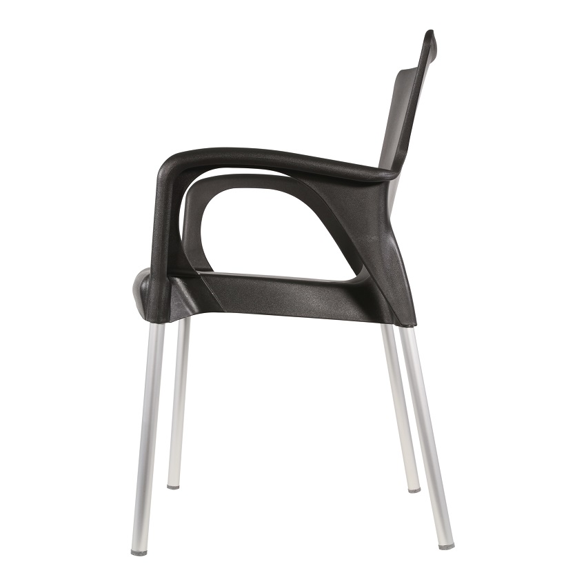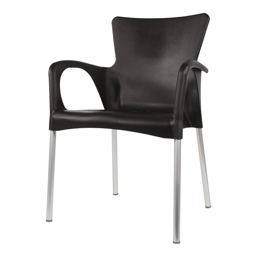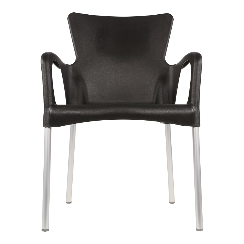 Kunststof stapelstoel met armleuning. Deze stapelstoelen zijn ideaal voor een kantine, het terras of in de tuin. De stoel is licht in gewicht waardoor het makkelijk te verplaatsen is. Doordat de stoelen stapelbaar zijn nemen ze weinig opslagruimte in beslag. De stoel is voorzien van armleuningen en heeft aluminium poten. De zithoogte is 45 cm en de stoel is 58 cm breed.