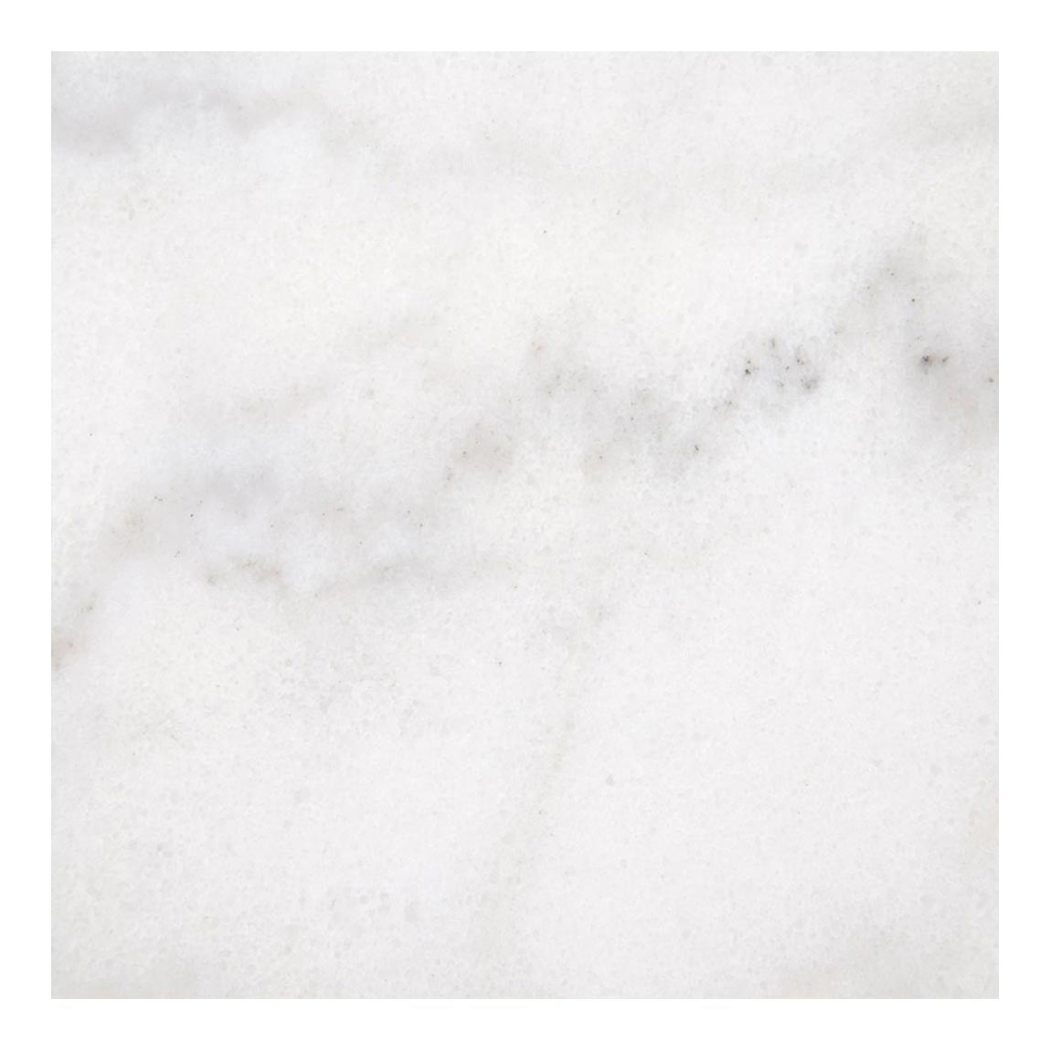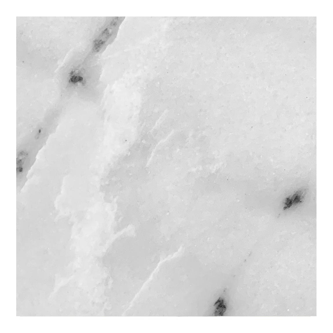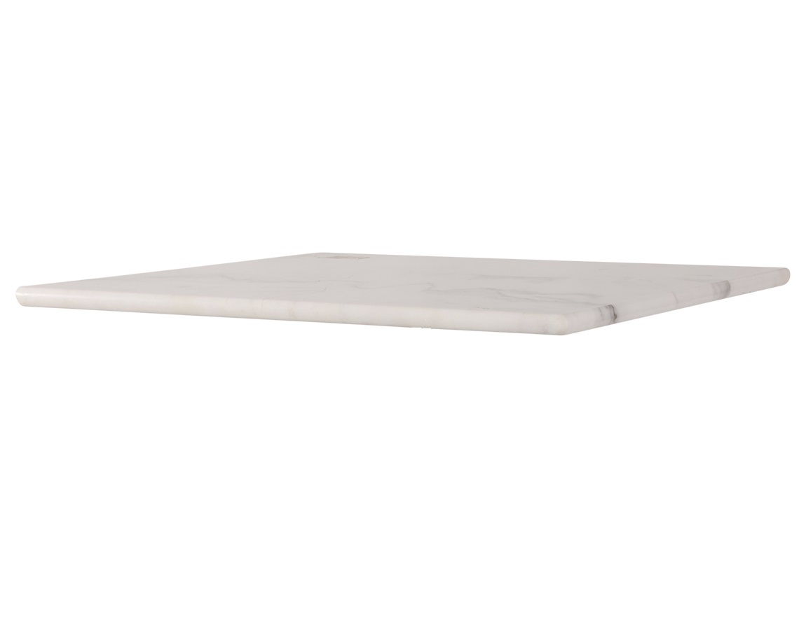 Vierkant wit marmer tafelblad met kleurschakeringen waar grijze aders en kristallen inzitten. Het tafelblad is 2 cm dik en heeft een afmeting van 70 x 70 cm. Dit tafelblad is heeft een vlakke onderkant waardoor het geschikt is voor diverse modellen tafelonderstellen.