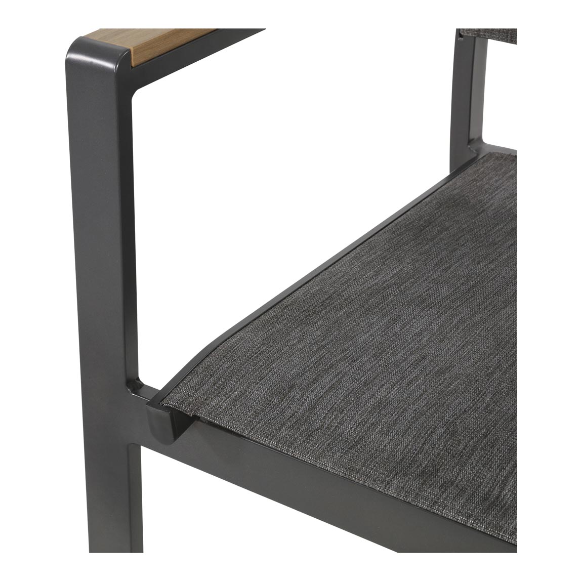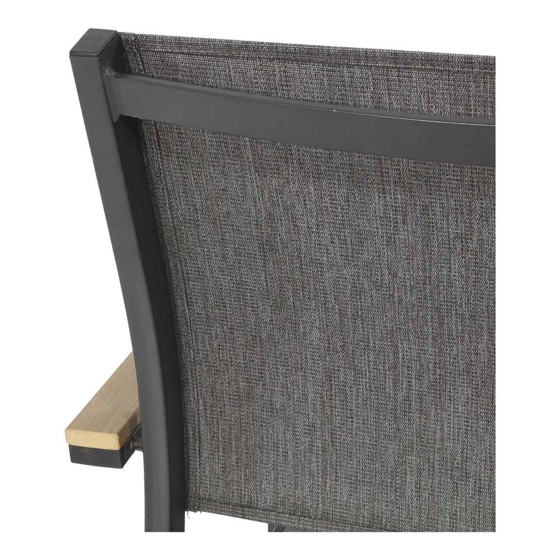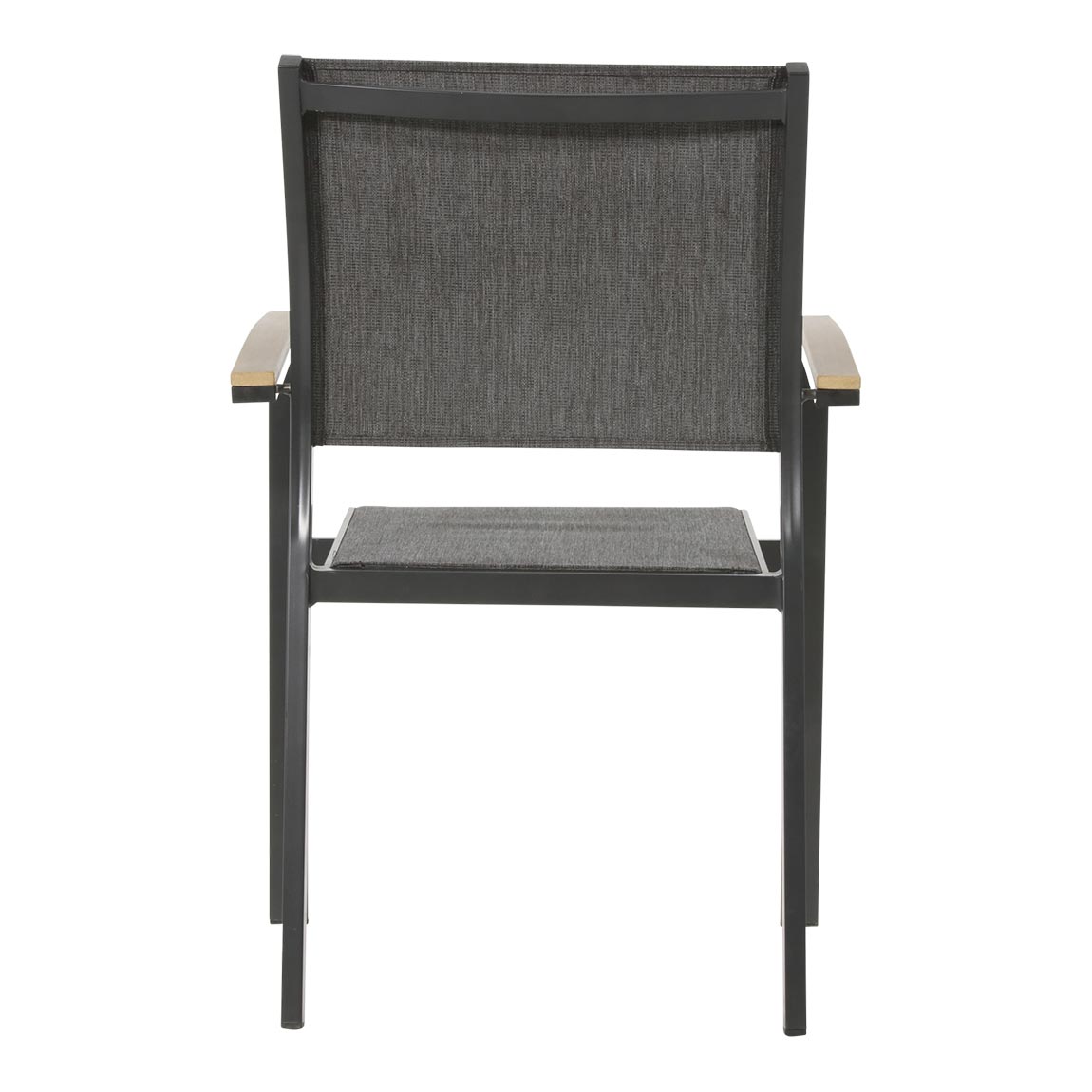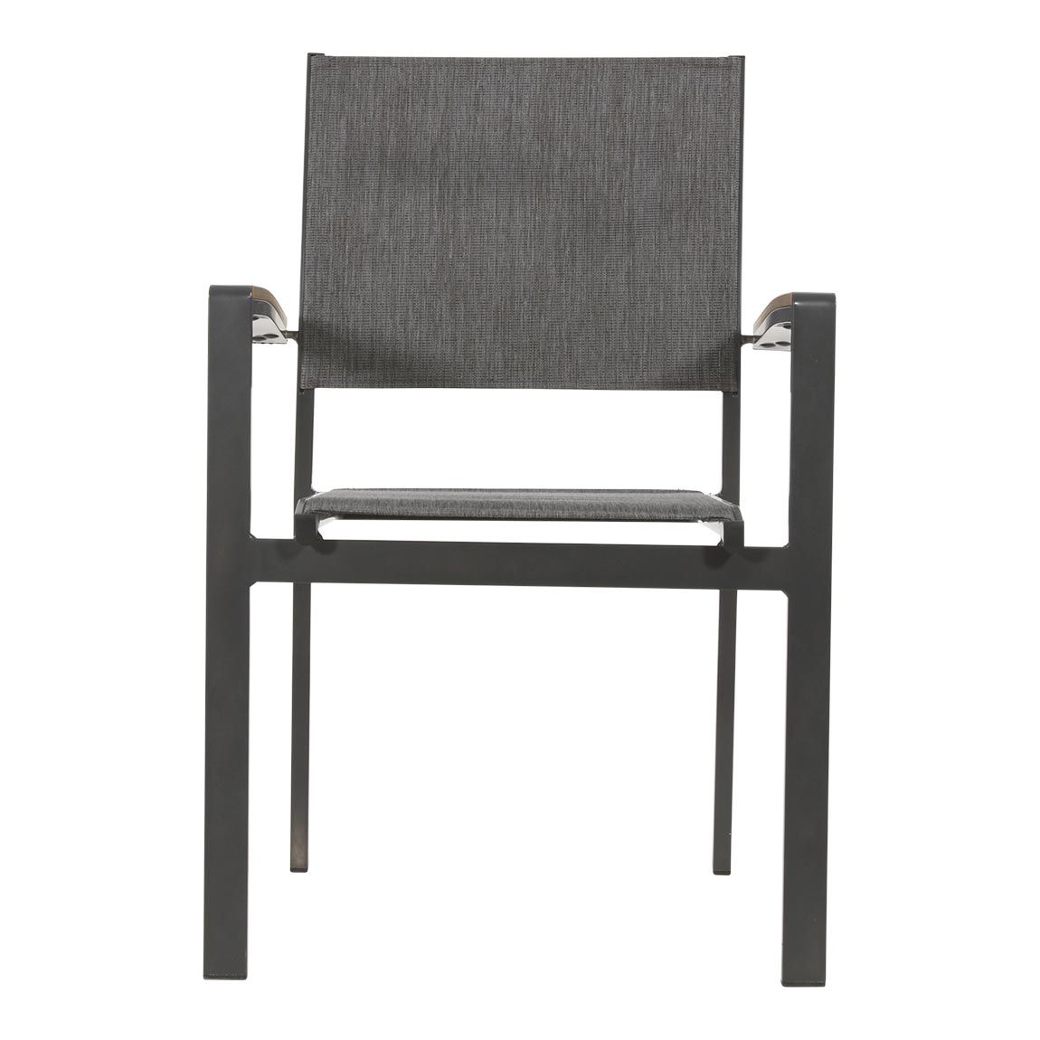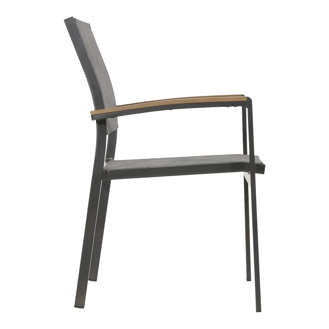 Stapelstoel model Arezzo. Deze terrasstoel heeft een aluminium frame met textileen zitting en rugleuning. De armleuningen zijn aan de bovenzijde bekleed met polywood. De stoel is licht van gewicht en stapelbaar.